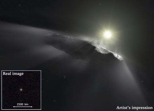 Artist’s impression of the first interstellar asteroid, "Oumuamua".(1I/2017 U1 ) This unique object was discovered on 19 October 2017 by the Pan-STARRS 1 telescope in Hawaii. Credit: ESO/M. Kornmesser