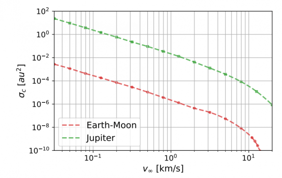 This figure from the research compares Jupiter’s efficacy at capturing ISOs into near-Earth orbits compared to the Earth-Moon efficacy. The math is fairly complex, but basically, the x-axis shows excess hyperbolic velocity, and as that rises, capture efficiency decreases. Image Credit: Mukherjee et al. 2023.