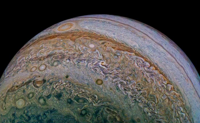 A multitude of magnificent, swirling clouds in Jupiter’s dynamic North North Temperate Belt is captured in this image from NASA’s Juno spacecraft. Appearing in the scene are several bright-white “pop-up” clouds as well as an anticyclonic storm, known as a white oval. Image Credit: Enhanced Image by Gerald Eichstädt and Sean Doran (CC BY-NC-SA)/NASA/JPL-Caltech/SwRI/MSSS