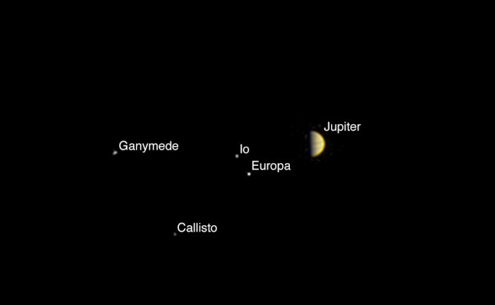 This annotated color view of Jupiter and its four largest moons -- Io, Europa, Ganymede and Callisto --