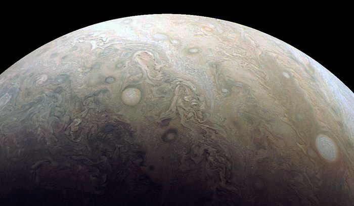 This is the original image sent by JunoCam on Dec. 11 and features the eighth in a string of large storms in the planet’s southern hemisphere. Credit: NASA/JPL-Caltech/SwRI/MSSS