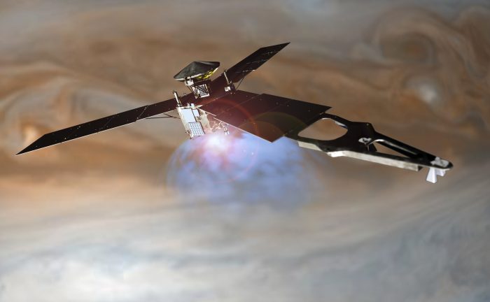Illustration of NASA's Juno spacecraft firing its main engine to slow down and go into orbit around Jupiter. Lockheed Martin built the Juno spacecraft for NASA's Jet Propulsion Laboratory. Credit: NASA/Lockheed Martin