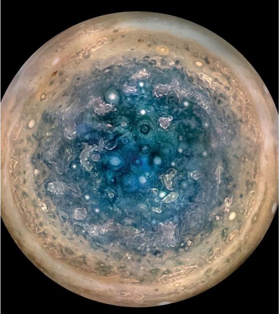 This image from Juno’s JunoCam captured the south pole in visible light only. It’s a puzzle why the north and south poles are so similar, yet have a different number of cyclones. Image: NASA/JPL-Caltech/SwRI/MSSS/Betsy Asher Hall/Gervasio Robles Credit bbc.com"