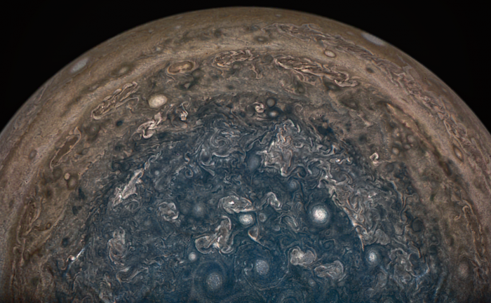 False color view of Jupiter’s polar haze, created by citizen scientist Gerald Eichstädt using data from the JunoCam instrument. Credit: NASA/JPL-Caltech/SwRI/MSSS/Eric Jorgensen