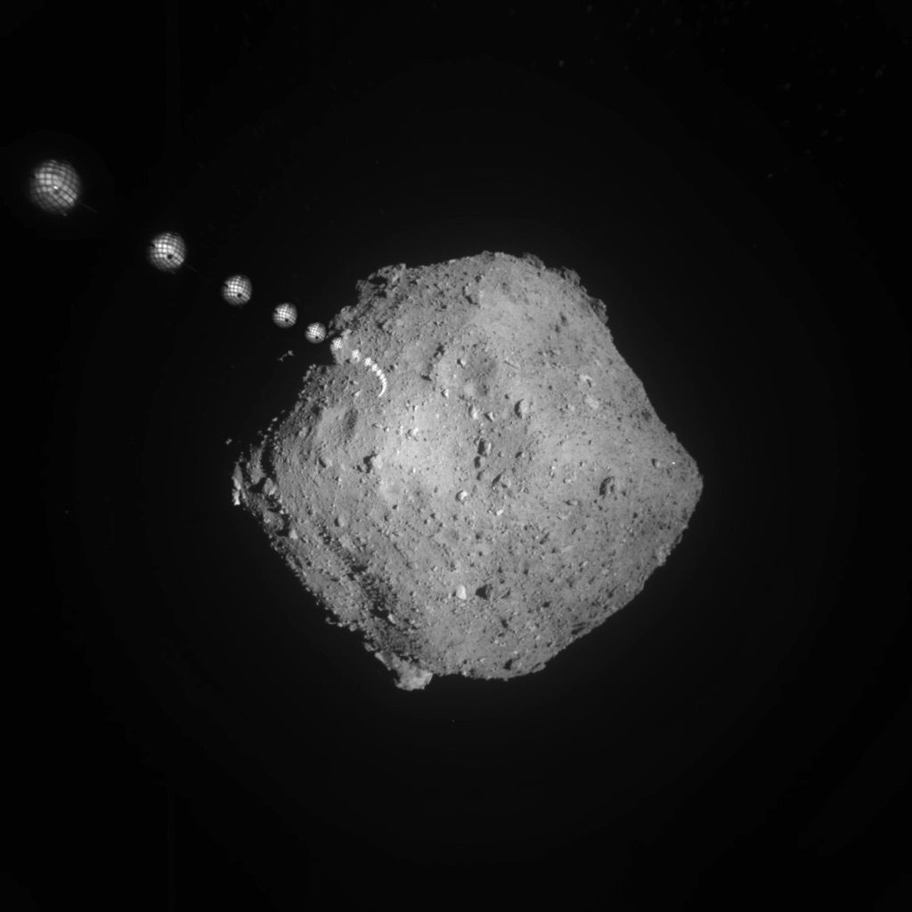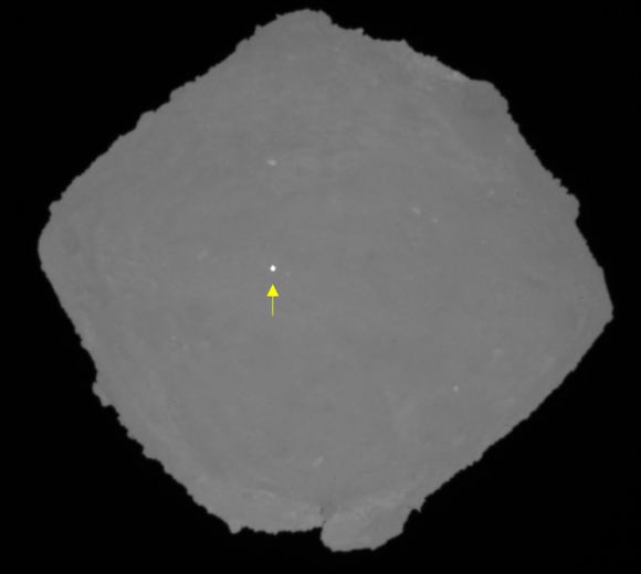 The SCI above Ryugu after being deployed by Hayabusa 2. It didn’t fire its projectile into the asteroid until the spacecraft had travelled to a safe distance away from any debris. Image: JAXA