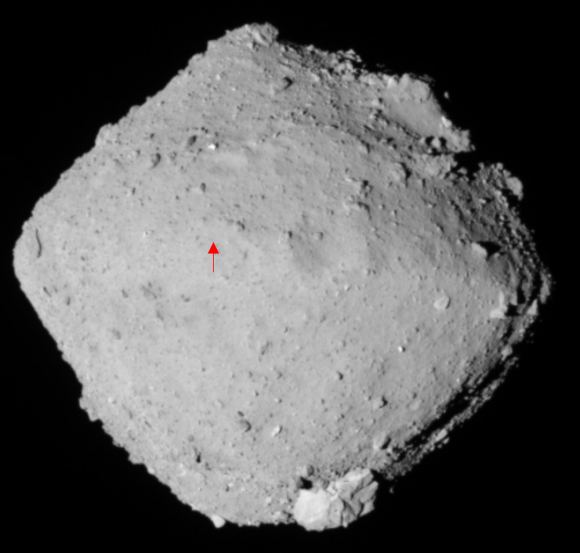 A well-lit image of the surface of Ryugu, captured by the Optical Navigation Camera – Telescopic on Hayabusa2 during BOX-B maneuvers. The red arrow marks the landing spot. Image Credit: JAXA, University of Tokyo, Kochi University, Rikkyo University, Nagoya University, Chiba Institute of Technology, Meiji University, University of Aizu, AIST.