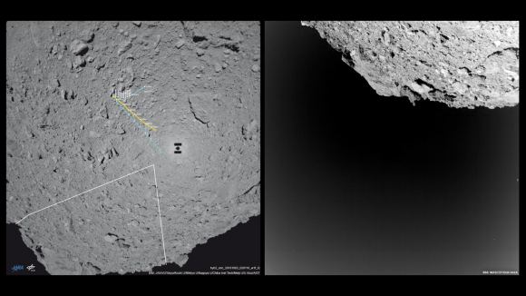 MASCAM captured the image on the right as it tumbled toward Ryugu’s surface. A huge boulder tens of meters wide casts a dark shadow. The image on the left contains a white open trapezoid, showing the direction of the image on the right. Image: MASCAM/DLR/JAXA