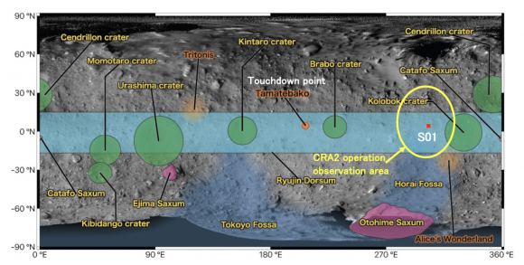 The location of where Hayabusa2 will conduct its second Crater Search Operation (CRA2). Credit: JAXA
