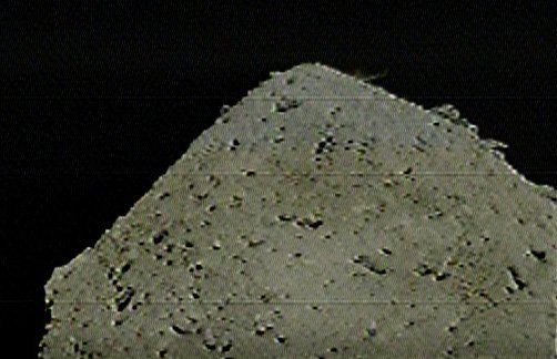 An image from one of Hayabusa2’s close approaches to Ryugu. The silhouette of the spacecraft is clearly visible. Hey, it looks like a Canada flag! Image Credit: JAXA