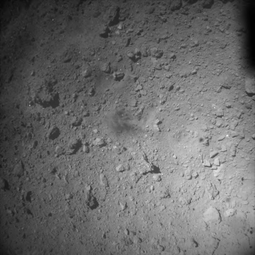 [PPTD] These images were taken immediately after today’s touchdown (Jul 11, 2019) with the ONC-W1. First photo was taken at 10:06:32 JST (on-board time) and you can see the gravel flying upwards. Second shot was at 10:08:53 where the darker region near the centre is due to touchdown.
