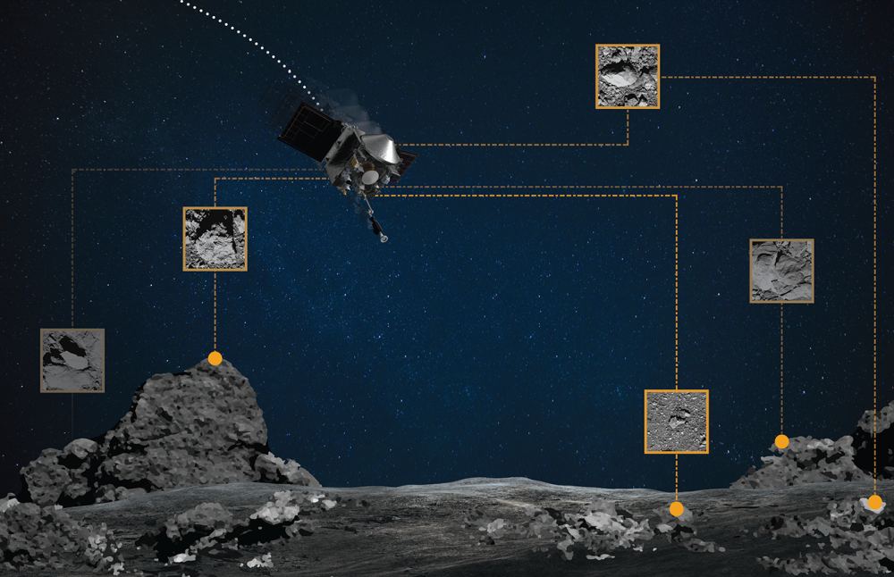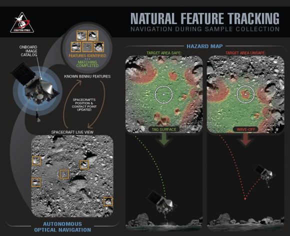 During the sample collection event, Natural Feature Tracking (NFT) will guide NASA’s OSIRIS-REx spacecraft to asteroid Bennu’s surface. The spacecraft takes real-time images of the asteroid’s surface features as it descends, and then compares these images with an onboard image catalog. The spacecraft then uses these geographical markers to orient itself and accurately target the touchdown site. Credit: NASA/Goddard/University of Arizona