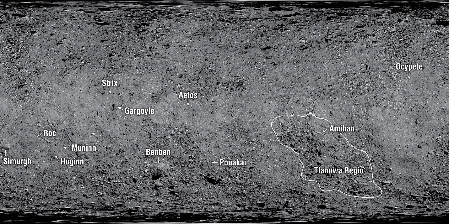 The large boulder spine in Bennu’s southern hemisphere is now called Tlanuwa Regio. It’s named for the giant birds who scattered the Earth with pieces of a serpent that turned into standing pillars of rocks in Cherokee mythology.