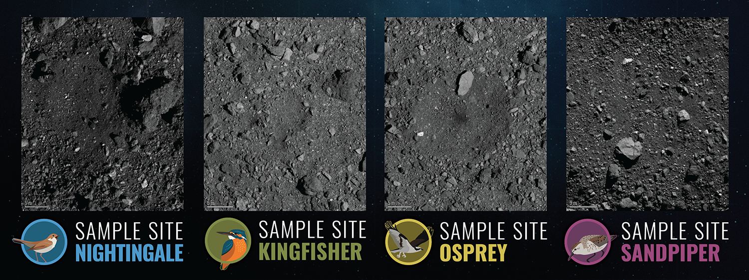 This flat projection mosaic of asteroid Bennu shows the relative locations of the four candidate sample collection sites on the asteroid: Nightingale, Kingfisher, Osprey and Sandpiper. NASA’s OSIRIS-REx spacecraft is scheduled to touch down on one of these four sites to collect a sample in summer 2020. Credits: NASA/Goddard/University of Arizona