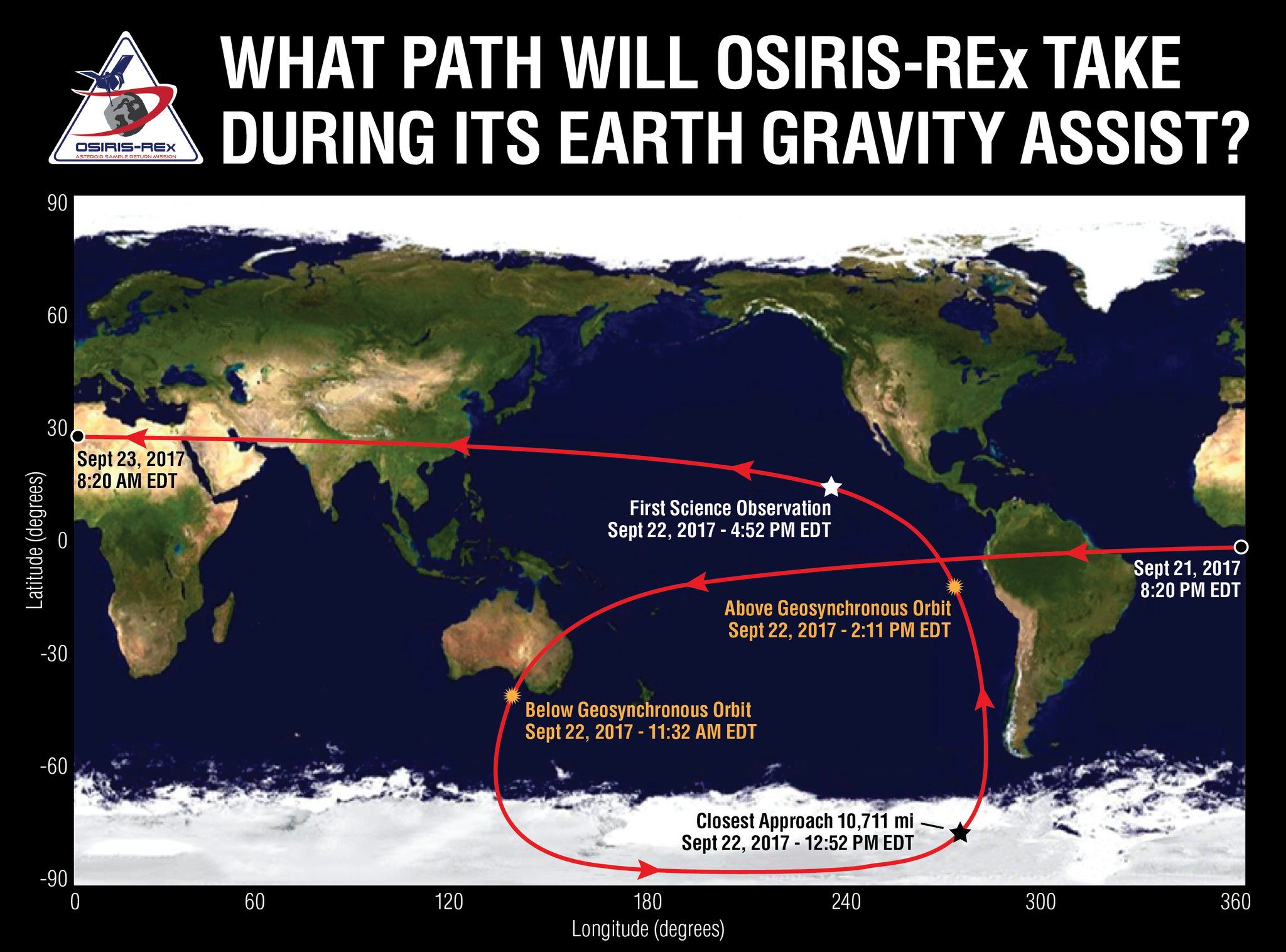 OSIRIS-REx flight path over Earth’s surface during the Sept. 22, 2017 slingshot over Antarctica at 12:52 a.m. EDT targeting the probe to Asteroid Bennu in August 2018. Credits: NASA’s Goddard Space Flight Center/University of Arizona