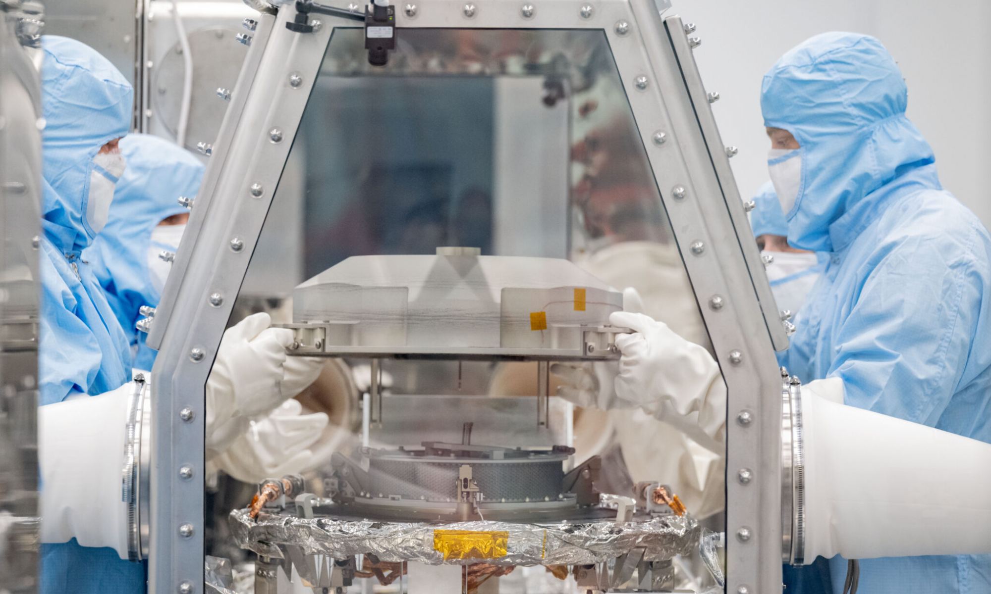 The University of Arizona’s camera suite, OCAMS, sits on a test bench that mimics its arrangement