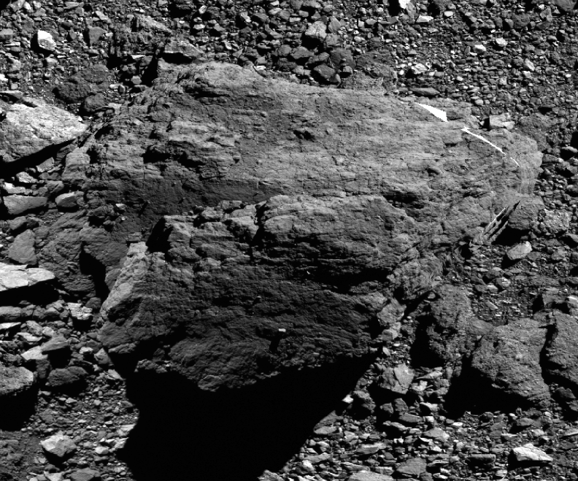 Gargoyle Saxum is named for the French dragon-like monster with wings, bird-like neck, and the ability to breathe fire. Gargoyle Saxum is a large prominent boulder near the mission’s backup sample site that is one of the darkest objects on the surface. Credit: NASA/Goddard/University of Arizona.