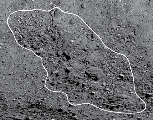 Site Kingfisher is located near asteroid Bennu’s equator in the northern hemisphere. The site itself is visible in the lower right of the image, located in the middle of the relatively clear space. The image was taken by the PolyCam camera on NASA’s OSIRIS-REx spacecraft on October 19, from a distance of 0.6 miles (1 km). The field of view is 47 ft (14.4 m). For reference, the small crater is 9 ft (2.7 m) across, which is about the length of a dolphin. Image Credit: NASA/Goddard/University of Arizona