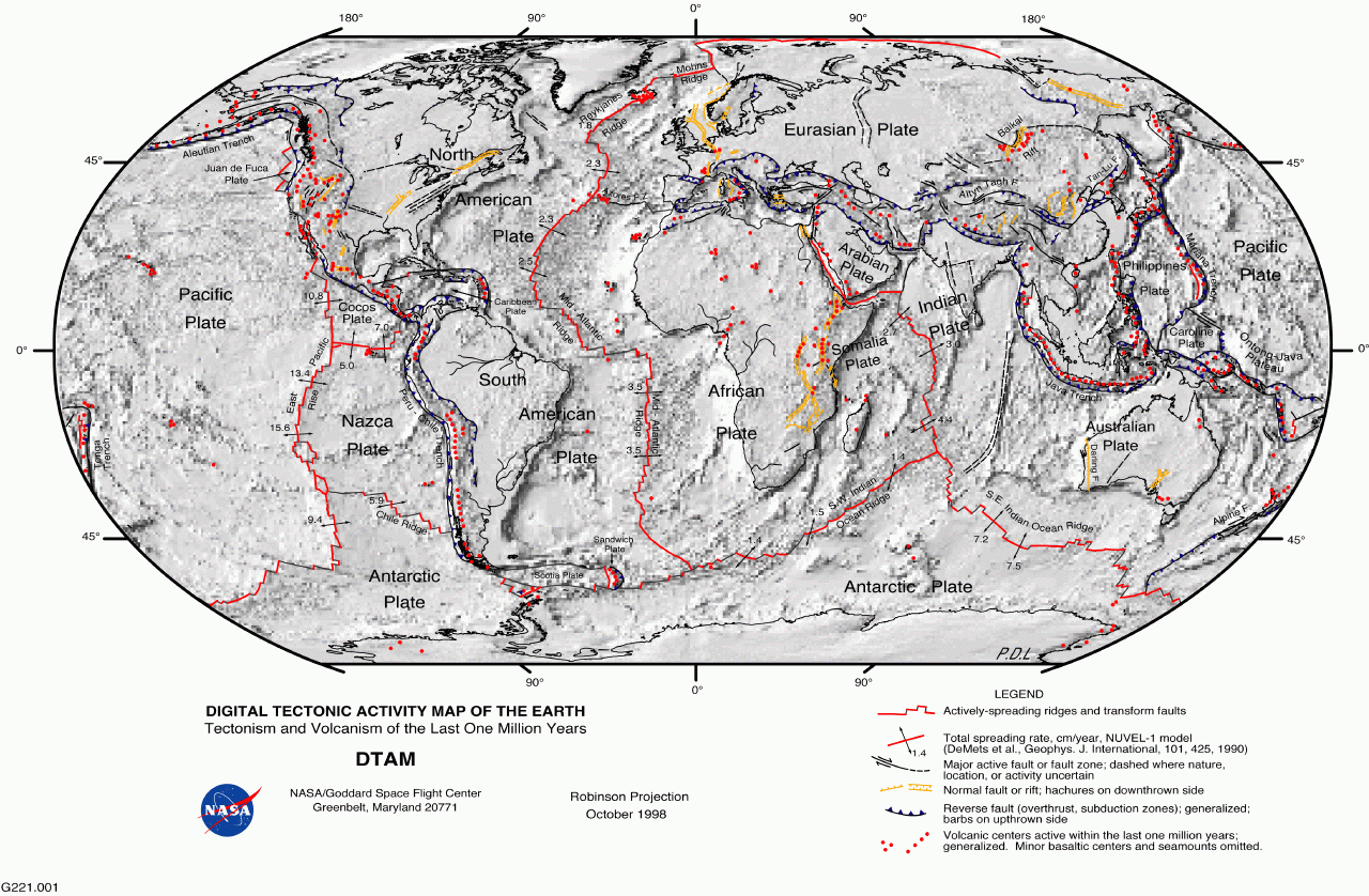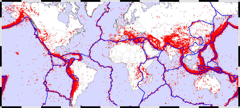 Map of the Earth showing fault lines (blue) and zones of volcanic activity (red). Credit: