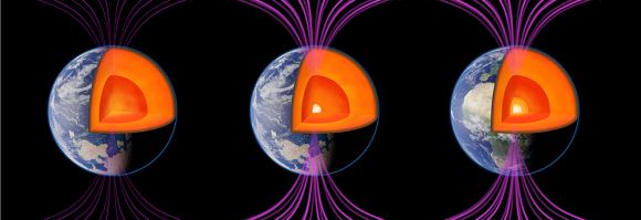 A depiction of Earth, first without an inner core; second, with an inner core beginning to grow, around 550 million years ago; third, with an outermost and innermost inner core, around 450 million years ago. University of Rochester researchers used paleomagnetism to determine these two key dates in the history of the inner core, which they believe restored the planet’s magnetic field just before the explosion of life on Earth. (University of Rochester illustration / Michael Osadciw)