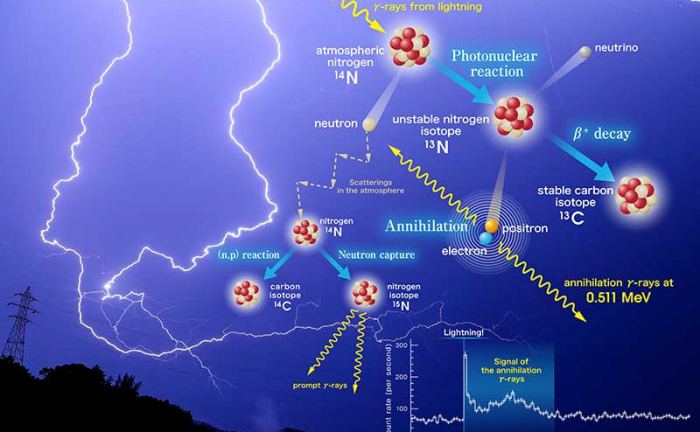It was here that things really got interesting. As the unstable nitrogen broke down, it released positrons that then collided with electrons, causing matter-antimatter annihilations that released more gamma rays. As Enoto explained, this demonstrated, for the first time that antimatter is something that can occur in nature due to common mechanisms.