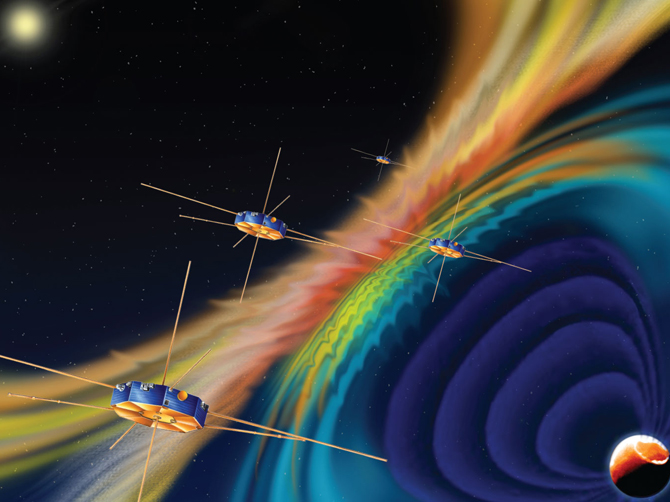 A colorful illustration shows the spacecraft of the Magnetospheric Multiscale Mission passing through the plasma of space. Credit: NASA