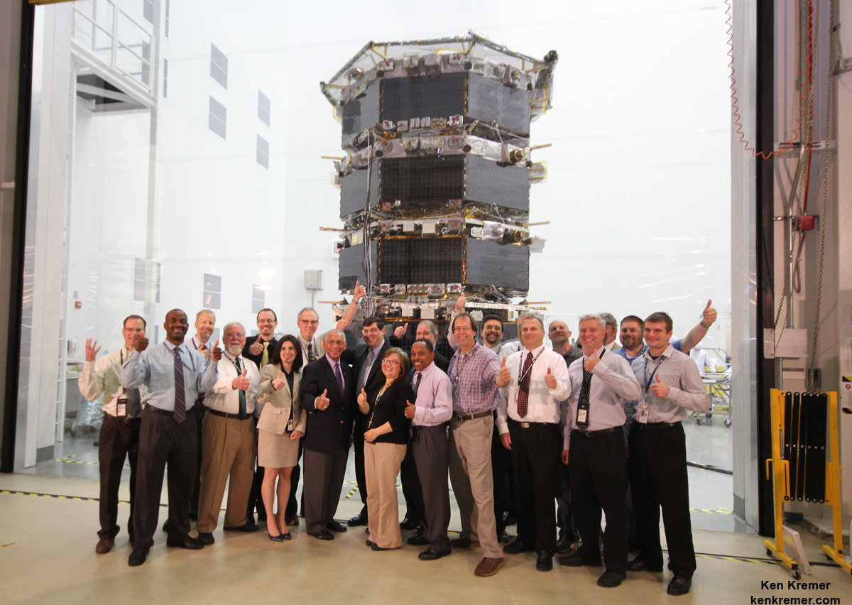 NASA Administrator Charles Bolden poses with the agency’s Magnetospheric Multiscale (MMS) spacecraft, mission personnel, Goddard Center Director Chris Scolese and NASA Associate Administrator John Grunsfeld, during visit to the cleanroom at NASA’s Goddard Space Flight Center in Greenbelt, Md., on May 12, 2014. Credit: Ken Kremer- Story updated[/caption]