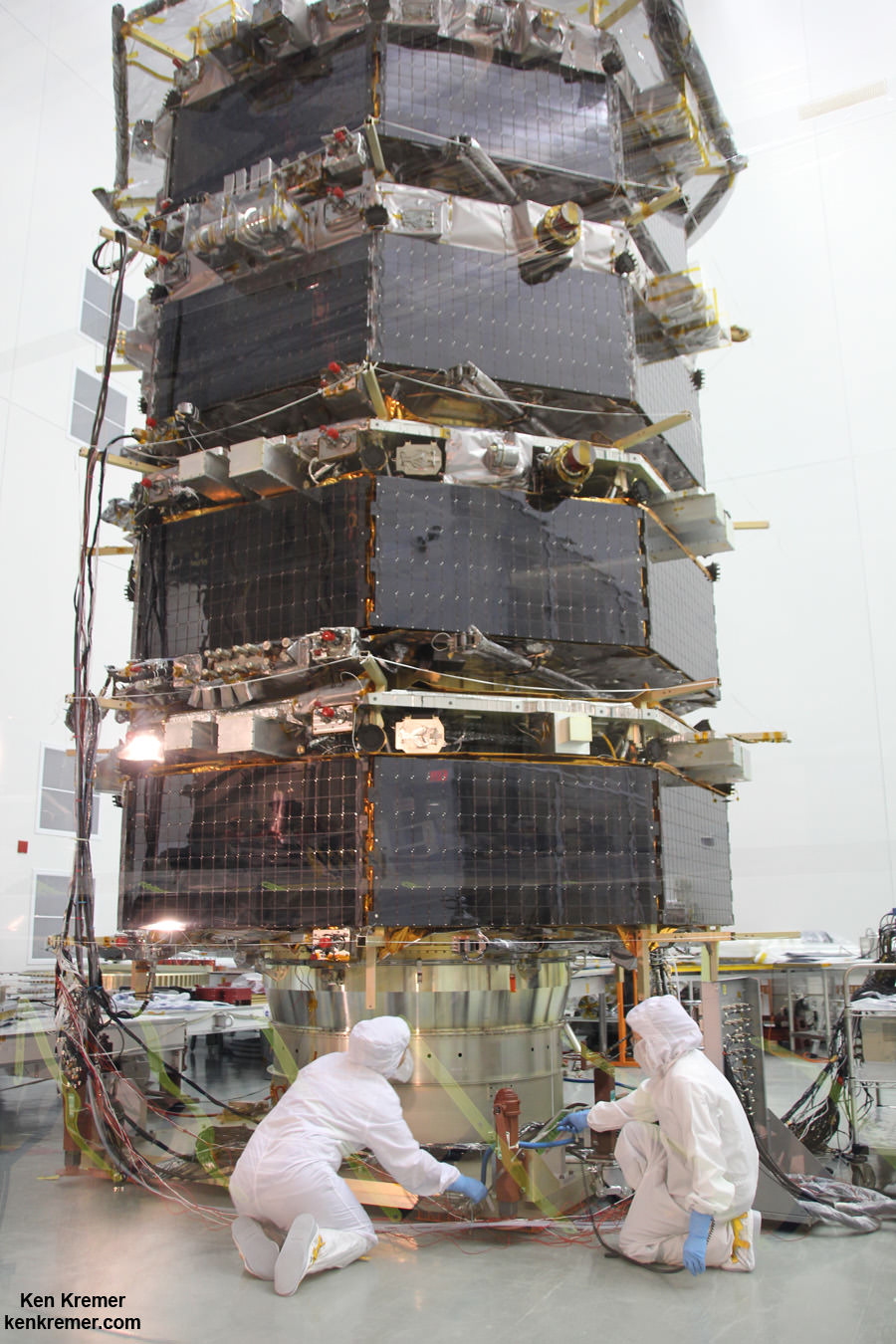 Technicians work on NASA’s 20-foot-tall Magnetospheric Multiscale (MMS) mated quartet of stacked observatories in the cleanroom at NASA’s Goddard Space Flight Center in Greenbelt, Md., on May 12, 2014. Credit: Ken Kremer-