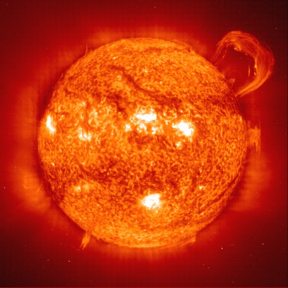 Sun with a huge coronal mass ejection. Usually the Sun’s magnetic field lines contain the plasma, but sometimes the lines break and the plasma is ejected. Image credit: NASA