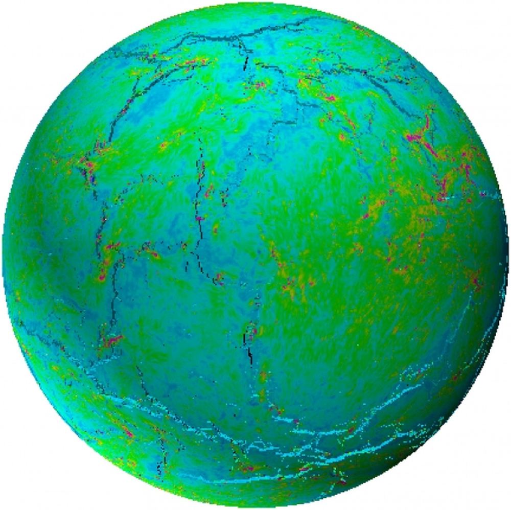 This figure from the study shows the development of a global system of fracturing. The top panel of six illustrated globes shows the global distribution of stress magnitudes over time, with negative values showing tensile stress, and positive values showing compressive stress. The bottom panel of six globes shows the associated displacement. For more detail, visit the study. Image Credit: Tang et al, 2020.