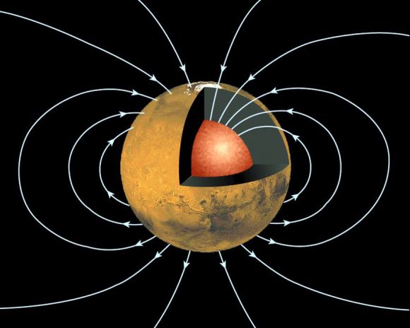 This figure shows a cross-section of the planet Mars revealing an inner, high-density core buried deep within the interior. Dipole magnetic field lines are drawn in blue, showing the global scale magnetic field associated with dynamo generation in the core. Ancient Mars must have had such a field, but today it is not evident. Perhaps the energy source that powered the early dynamo has shut down. Credit: NASA/JPL/GSFC