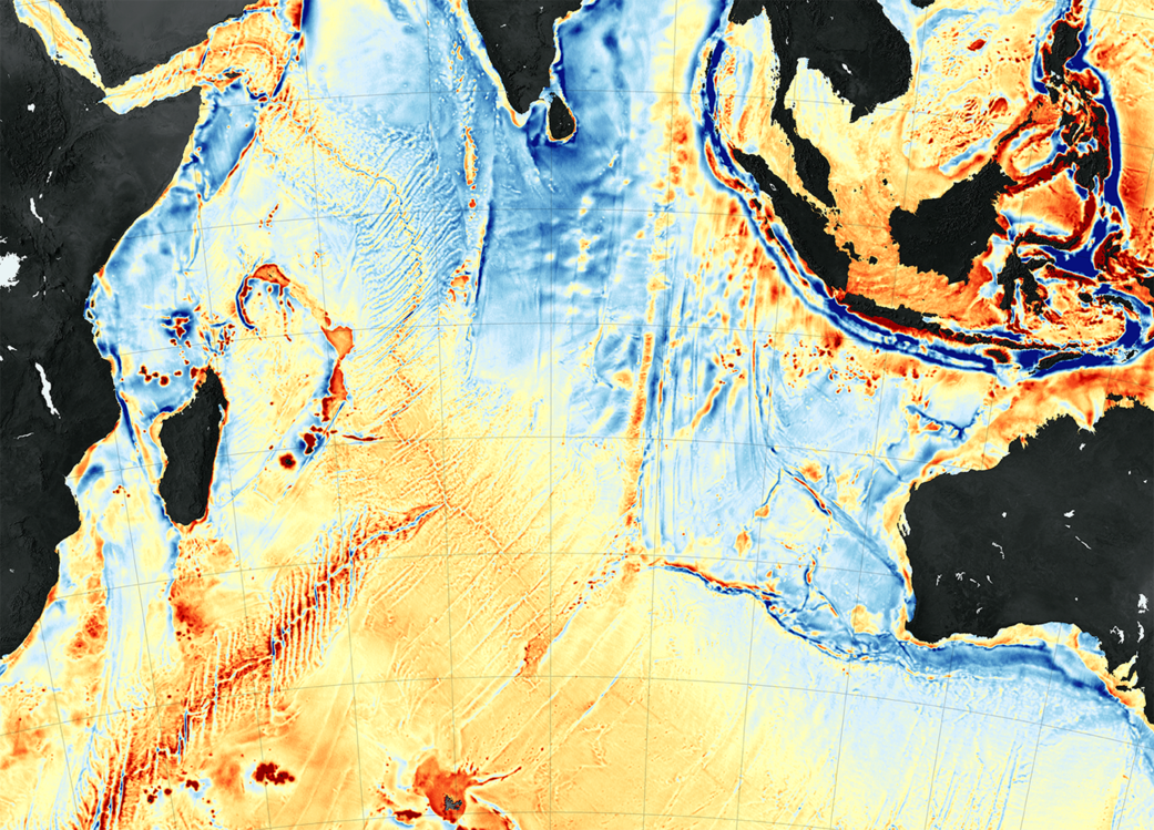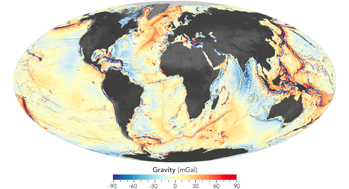 is slightly stronger than usual, while in blue areas gravity is slightly weaker.