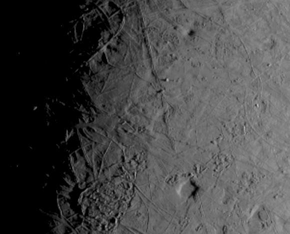 Image of Europa’s ice shell, taken by the Galileo spacecraft, of fractured “chaos terrain”. Credit: NASA/JPL-Caltech