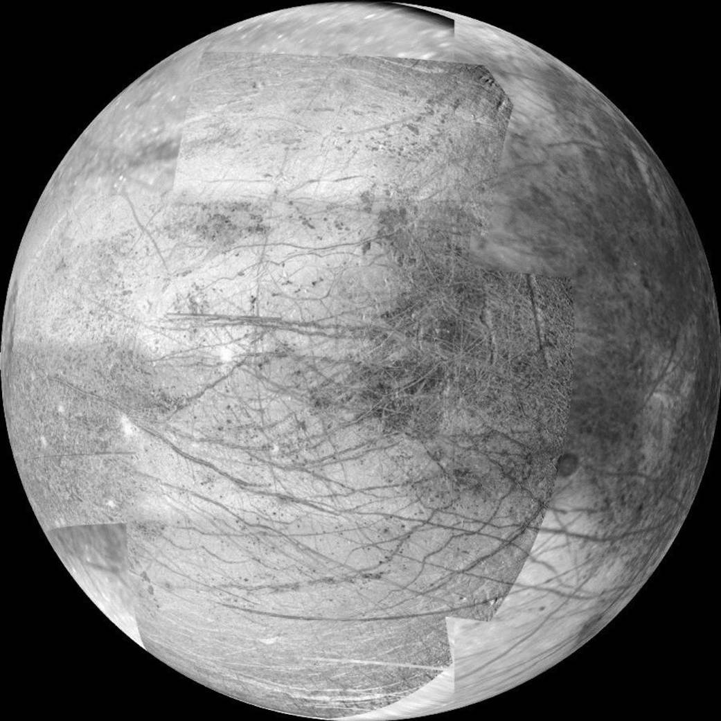 Images from NASA’s Galileo spacecraft show the intricate detail of Europa’s icy surface.