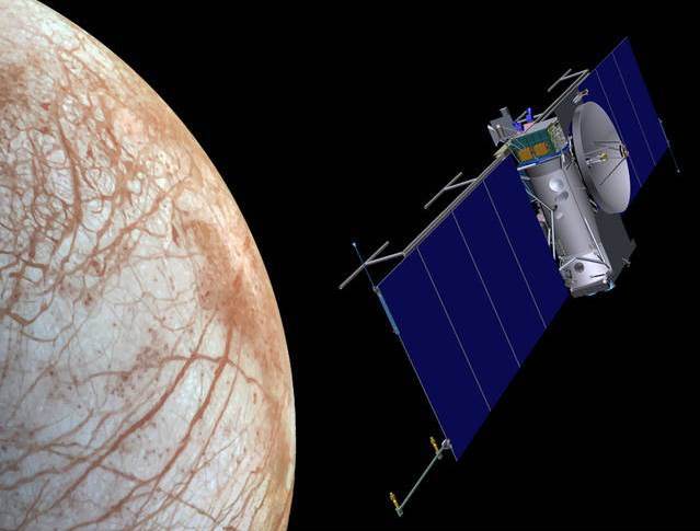 (This artist's rendering shows a concept for a future NASA mission to Europa in which a spacecraft would make multiple close flybys of the icy Jovian moon,