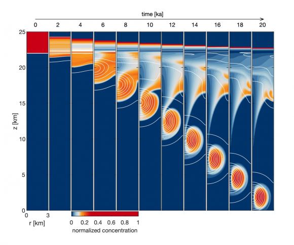 The physics-based model built by the researchers shows a porosity wave (spherical shape) carrying brine and oxygen at Europa’s surface through the moon’s ice shell to the liquid water ocean below. The chart shows time (in thousands of years) and ice shell depth (in kilometres). Red indicates higher levels of oxygen. Blue represents lower levels of oxygen. Credit: Hesse et al. 2022