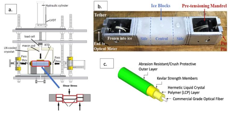 This figure illustrates the tether design and the test bed used to simulate Europa’s unique conditions. (a) shows the test rig, and the red outlined area is shown in (b). (c) is a schematic of one of the two fibre optic cables tested, called a Linden Photonics High Strength Strong Tether Fibre Optic Cable. Image Credit: NASA/STI