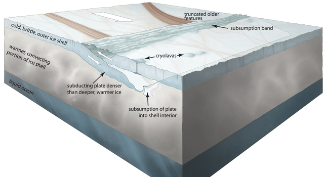 Scientists have found evidence of plate tectonics on Jupiter’s moon Europa. This conceptual illustration of the subduction process (where one plate is forced under another) shows how a cold, brittle, outer portion of Europa’s 20-30 kilometer-thick (roughly 10-20 mile) ice shell moved into the warmer shell interior and was ultimately subsumed. A low-relief subsumption band was created at the surface in the overriding plate, alongside which cryolavas may have erupted. Image credit: Noah Kroese, I.NK
