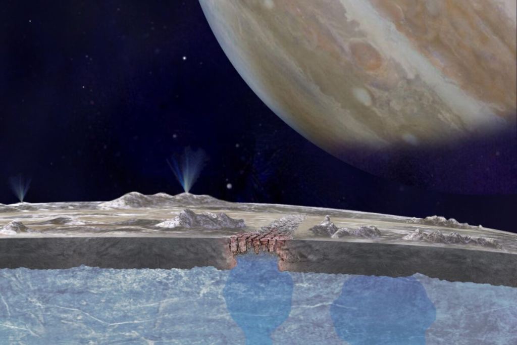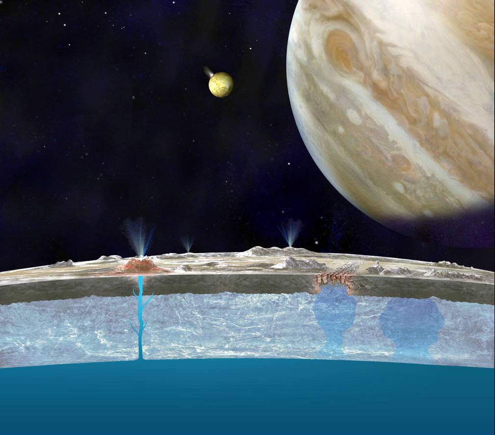 Artist’s concept of the cross-sectional view of Europa depicting the exciting, potentially habitable environment of the ocean world (Credit: K. Hand et al./NASA/JPL)