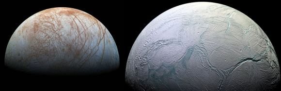 Jupiter’s Europa (l) and Saturn’s Enceladus (r). Both moons have icy shells with oceans underneath, and scientists think that Europa has more water than all of Earth’s oceans combined, and it’s likely warm and salty. Missions to study Europa are in the planning stages. Image Credits: NASA