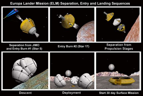 NASA’s been wondering about a mission to Europa for many years. The JIMO Europa Lander idea is from the early 2000s and featured a lander with a 30-day mission. While a tunnelling cryobot mission is what everyone wants to see, a preliminary lander mission is a likely first step. Image Credit: By Jet Propulsion Laboratory – Small RPS-Enabled Europa Lander Mission,, Public Domain (from wikipedia)