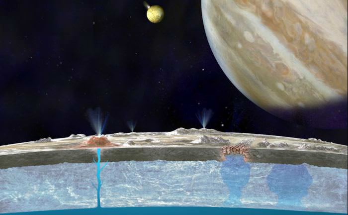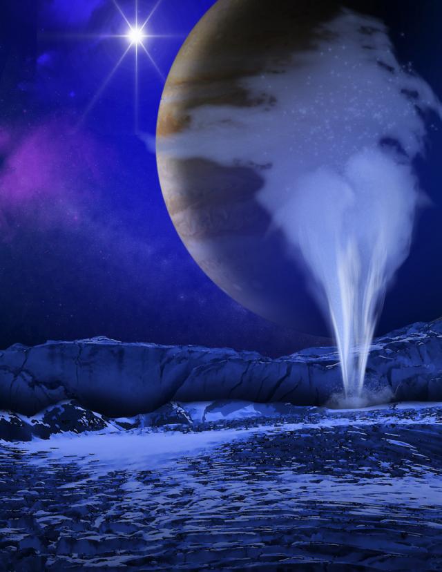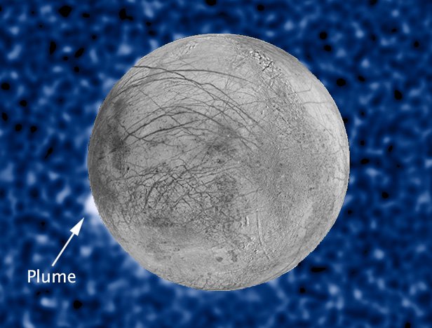 A plume of subsurface ocean water vapor escapes through a crack in the icy crust of Europa, a moon of Jupiter CREDIR:.NASA/ESA/K. Retherford/SWRI) Jupiter's moon Europa — a giant ice ball thought to hide twice as much liquid water as there is on Earth —