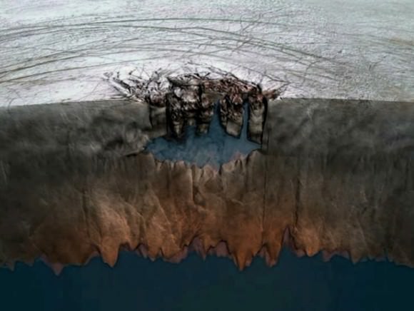 Europa’s “Great Lake.” Scientists speculate many more exist throughout the shallow regions of the moon’s icy shell. Credit: Britney Schmidt/Dead Pixel FX/Univ. of Texas at Austin.