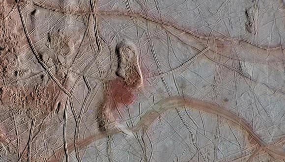 This image from NASA’s Juno spacecraft shows an area of Europa’s surface north of the equator. The prominent pit seen in the lower half of the image might be a degraded impact crater. (NASA / JPL-Caltech / SwRI / MSSS)