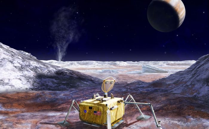 Artist’s rendering of a possible Europa Lander mission, which would explore the surface of the icy moon in the coming decades. Credit:: NASA/JPL-Caltech