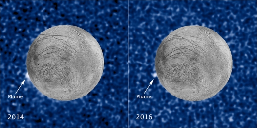 Image: These composite images show a suspected plume of material erupting two years apart from the same location on Jupiter’s icy moon Europa. The newly imaged plume, shown at right, rises about 100 kilometers above Europa’s frozen surface. The image was taken Feb. 22, 2016. The plume in the image at left, observed by Hubble on March 17, 2014, originates from the same location. It is estimated to be about 50 kilometers high. The snapshot of Europa, superimposed on the Hubble image, was assembled from data from NASA’s Galileo mission to Jupiter. Credit: NASA/ESA/W. Sparks (STScI)/USGS Astrogeology Science Center.