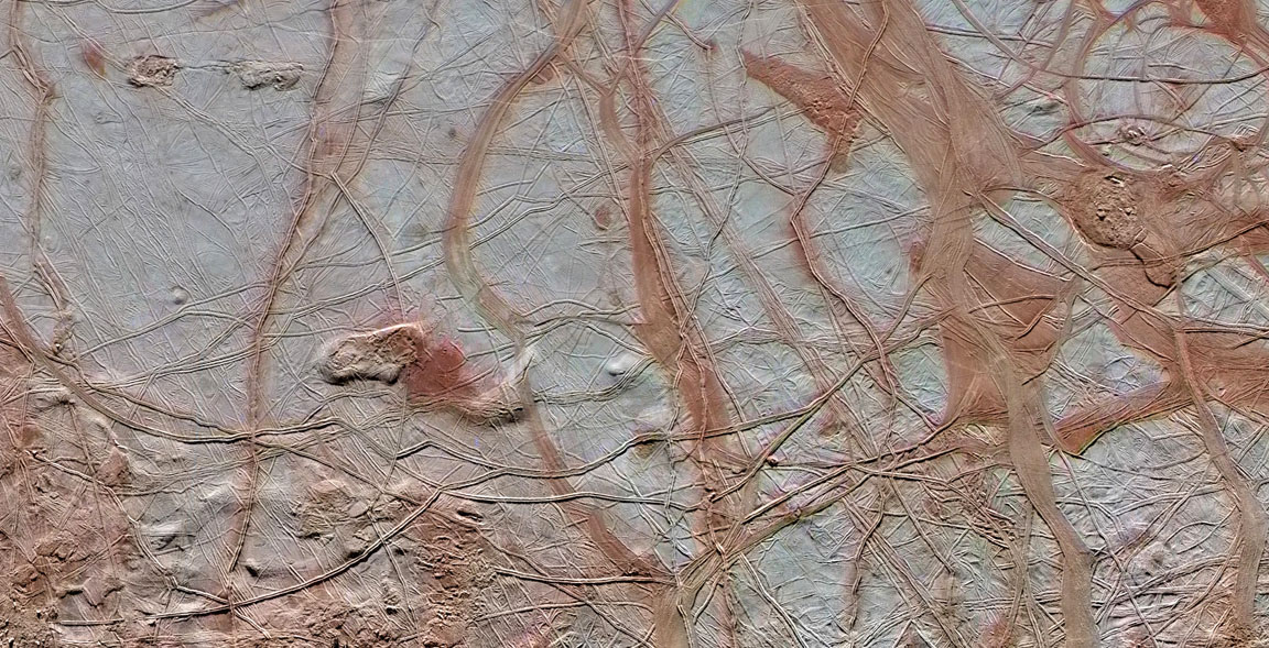 Images from NASA’s Galileo spacecraft show the intricate detail of Europa’s icy surface. Image: NASA/JPL-Caltech