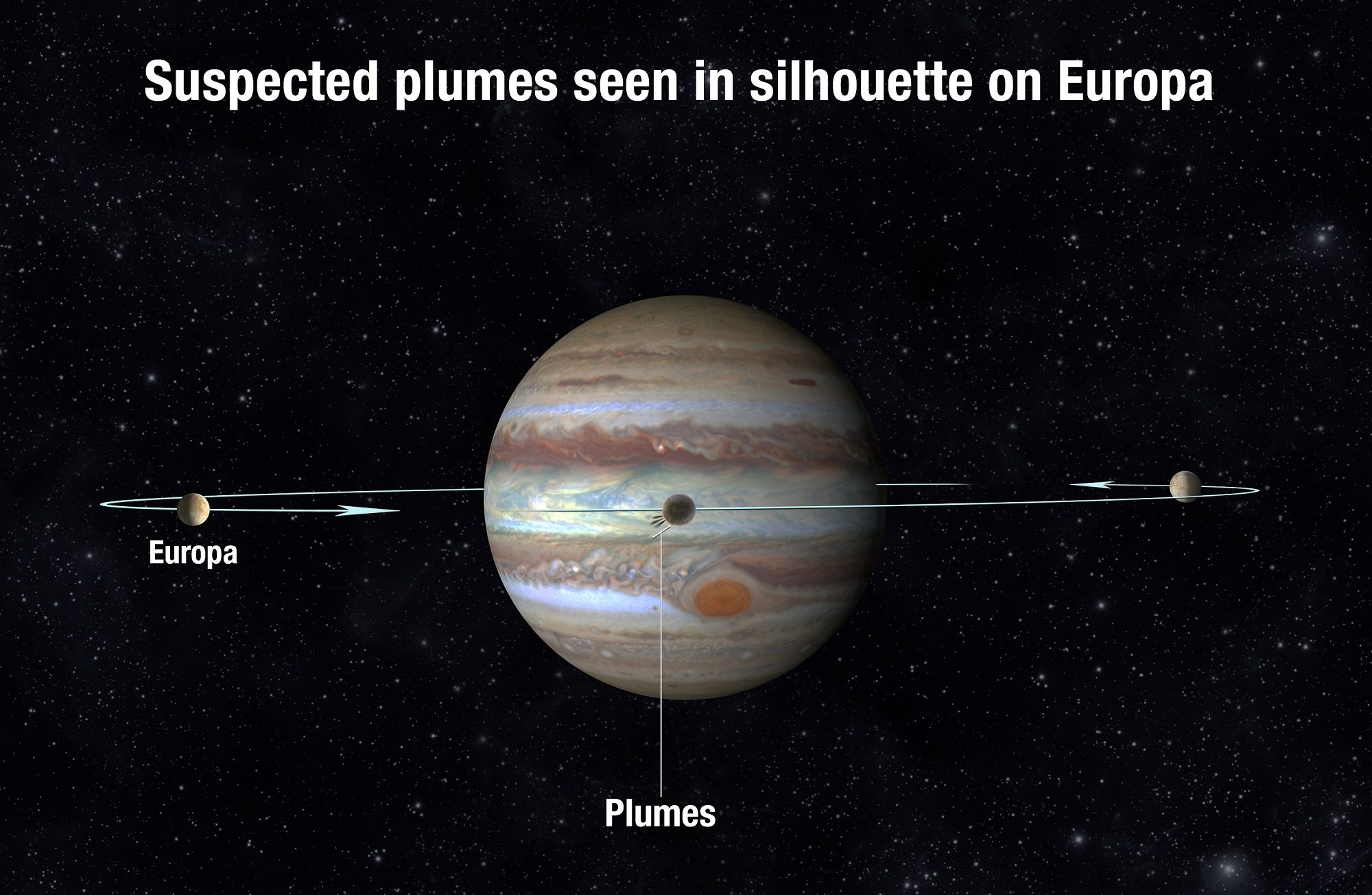 This composite image shows suspected plumes of water vapor erupting at the 7 o’clock position off the limb of Jupiter’s moon Europa. The Hubble data were taken on January 26, 2014.