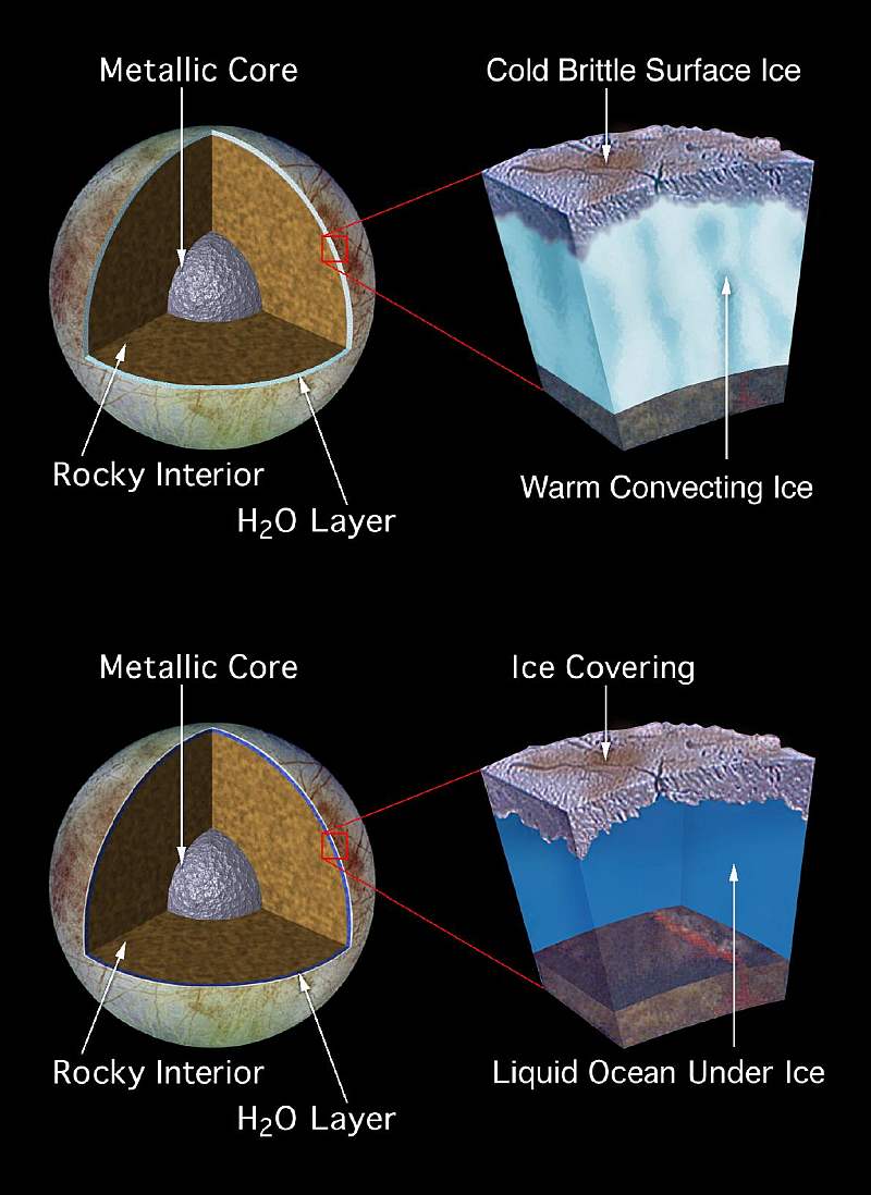 Two models of the interior of Europa. A tunneling robot would be able to tunnel through the ice and search for life. Image: NASA/JPL.