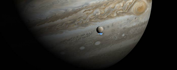 An artist’s rendering of Europa and Jupiter based on images sent by visiting spacecraft. Credit: NASA/JPL-Caltech