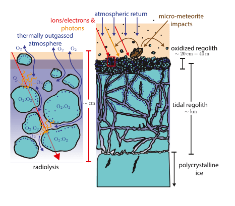 This figure from the 2022 research helps explain how oxygen could make it through the ice and into Europa’s ocean. Some of the O2 is released into the moon’s atmosphere, but most of it returns to the icy regolith and is trapped in bubbles. The bubbles are the dominant near-surface reservoir for oxidants. Over thousands of years, the bubbles can make their way down to the ocean. Image Credit: Hesse et al. 2022.